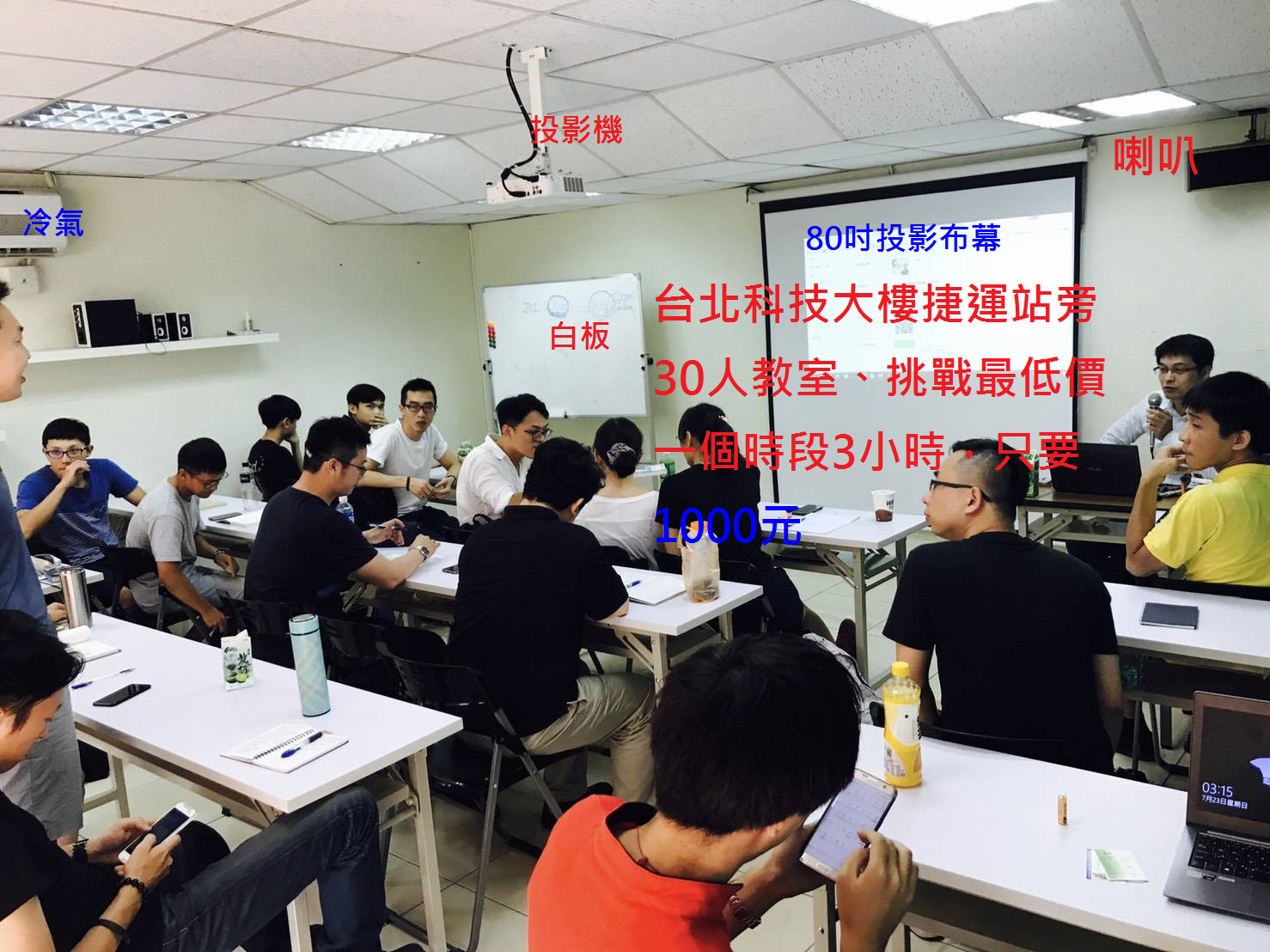 設備:空調、照明、白板、無限麥克風、擴大機×1、喇叭×2、投影布幕×1、投影機×1